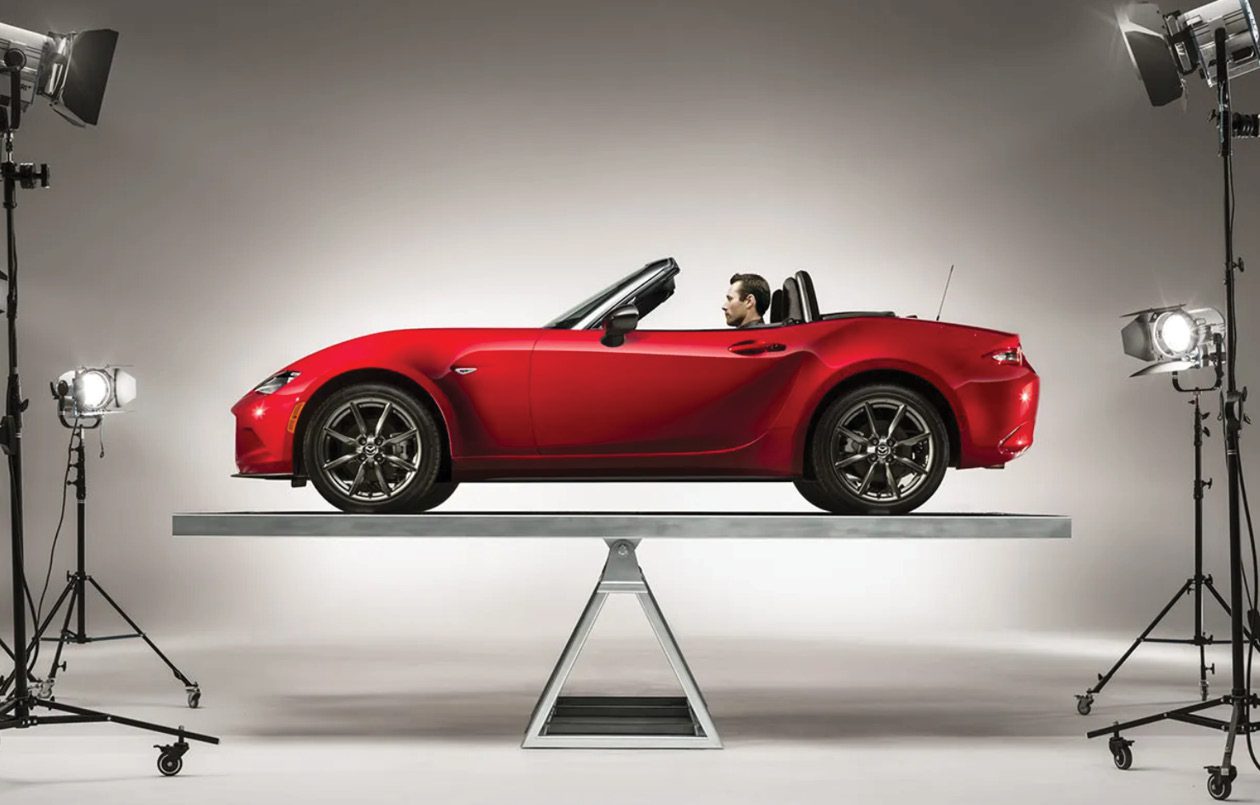 זה לא שהמיאטה החליטה לעשות הסבה מקצועית ולהתמודד בתרגילים על קורה. זו דוגמא מוחשית לכמה היא מאוזנת. הרי הנדסה מצייתת לחוקי הפיזיקה, ובכל הקשור למכוניות איזון של  50/50 (חצי מהמשקל לפנים וחצי מאחור), מייצר מצב שבו יש אותו משקל על הגלגלים הקדמיים והאחוריים, ואין סרח עודף של משקל (מלפנים או מאחור) שמפר את האיזון בזמן כניסה לפניות. ובמלים אחרות, המאזדה MX-5. איך ממחישים את היכולת הזאת? כך ממחישים: במשקל 1,050 ק"ג (כולל הנהג), המכונית נותרת מאוזנת בצורה מושלמת על קורת האלומיניום המיוחדת. ובמלים אחרות, כדי לשמור על האיזון הכה עדין הזה, אתם חייבים לשקול בדיוק כמו הנהג על הקורה (לא באמת).